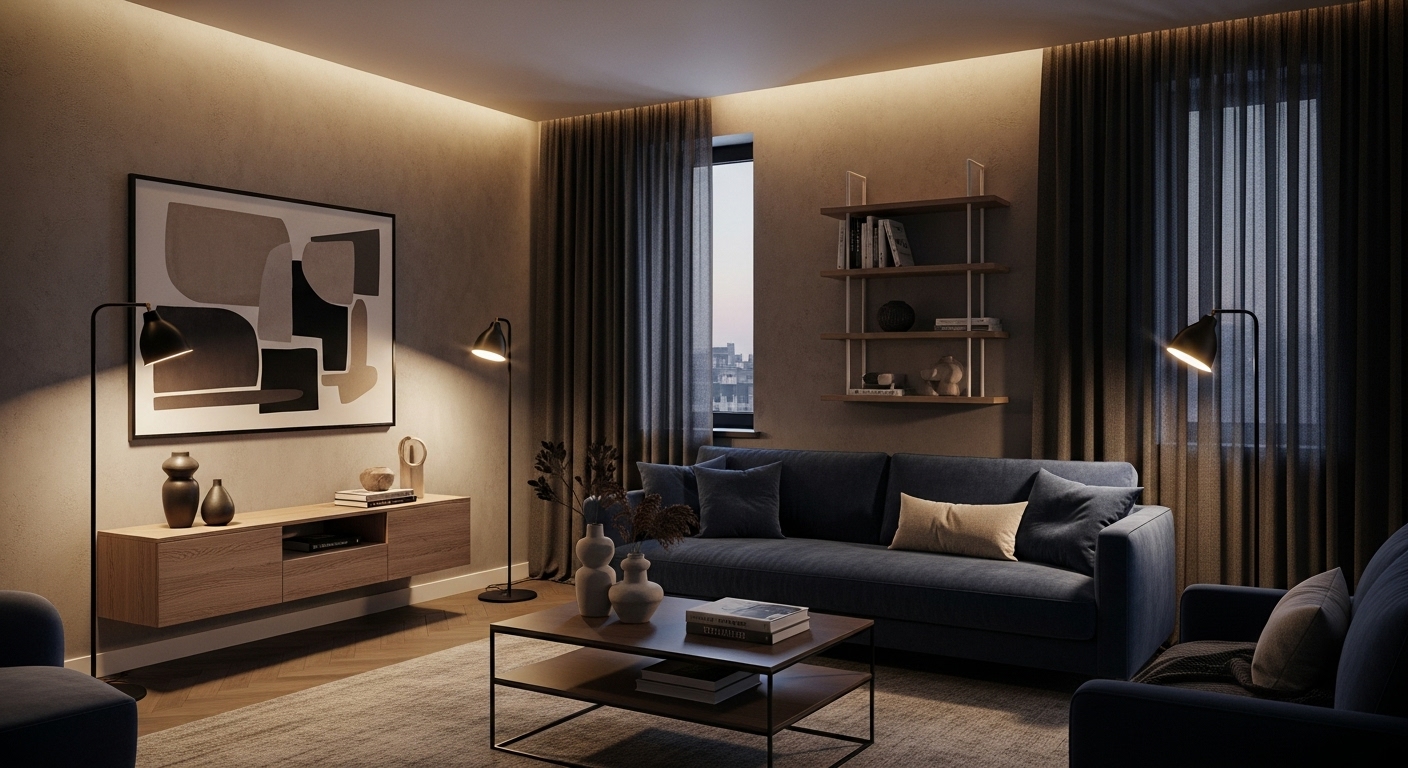 Pencahayaan hangat (warm lighting) sangat penting agar ruangan tidak terasa terlalu gelap. Lampu meja, lampu lantai, dan indirect lighting bisa menjadi solusi ideal.